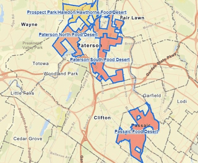 The designation of “Food Desert Communities” includes consideration of factors such as food retail environment, demographics, economic indicators, and health indicators. The NJEDA developed the list and accompanying methodology for designation of the “Food Desert Communities” in partnership with the New Jersey Department of Community Affairs (NJDCA) and the New Jersey Department of Agriculture (NJDA), along with input from the New Jersey Department of Human Services (NJDHS) and New Jersey Department of Health (NJDOH).