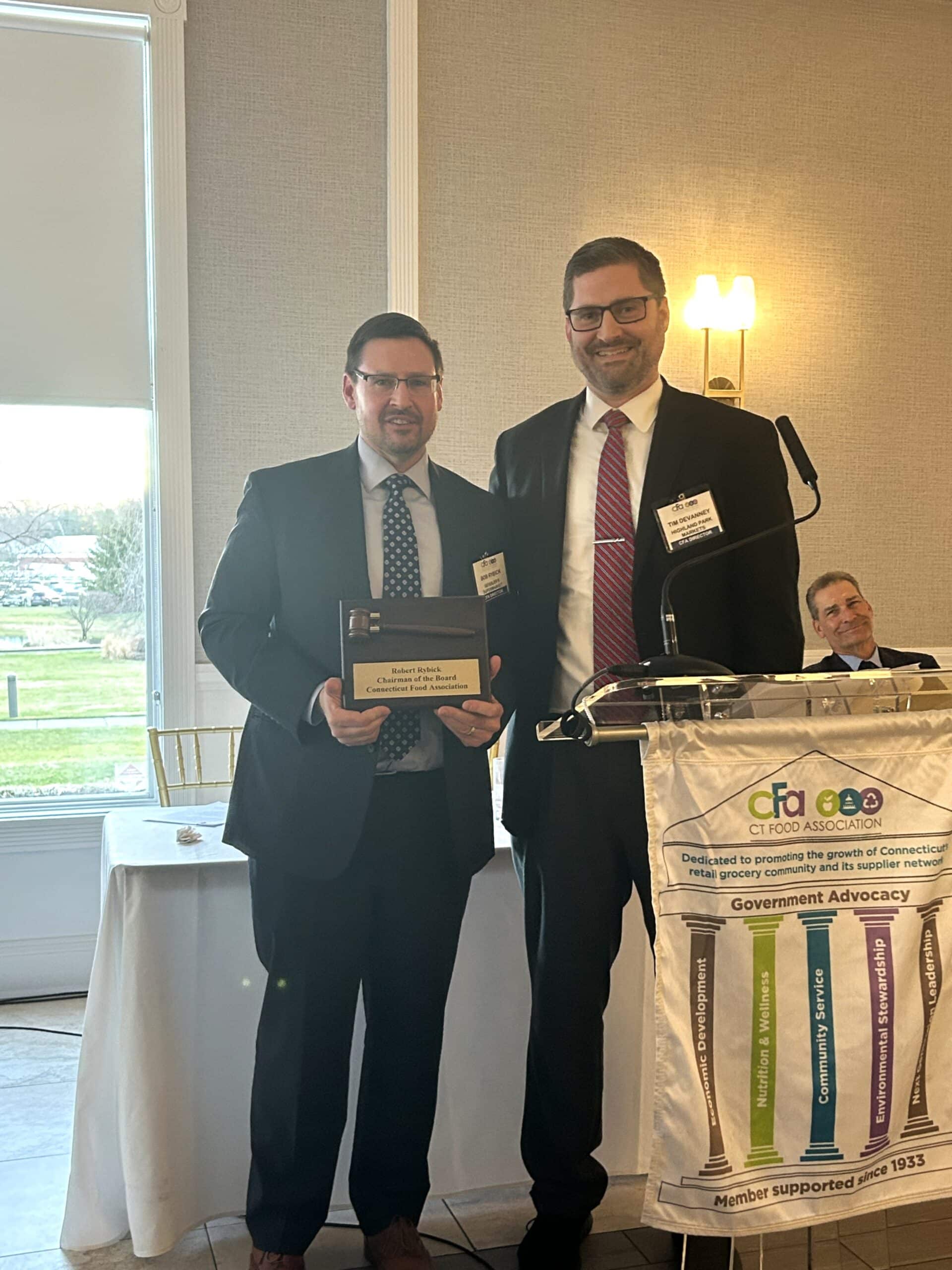 The Connecticut Food Association (CFA) held its 2026 Annual Meeting and Installation of Officers Dinner last month at Farmington Polo Club in Farmington, CT. Below, outgoing CFA chairman Rob Rybick of Geissler’s welcomes incoming chair Tim Devanney of Highland Park Market.