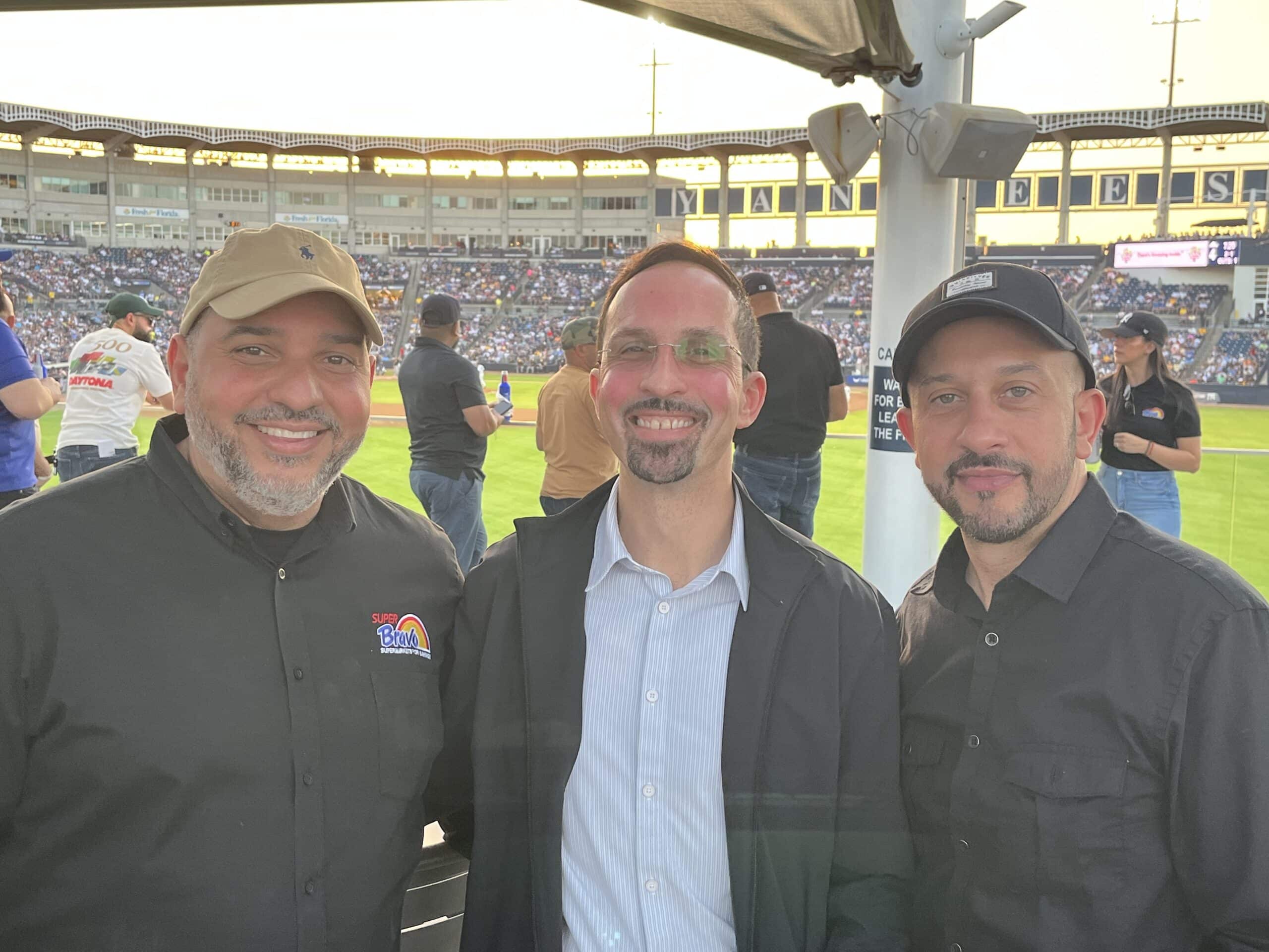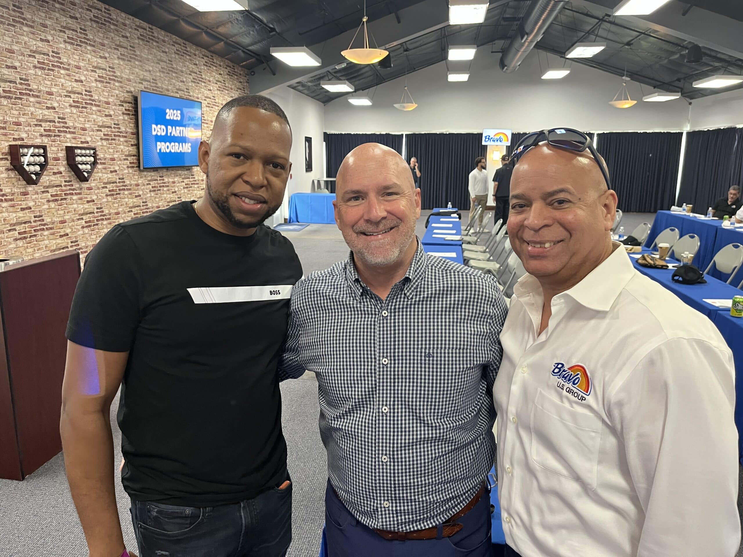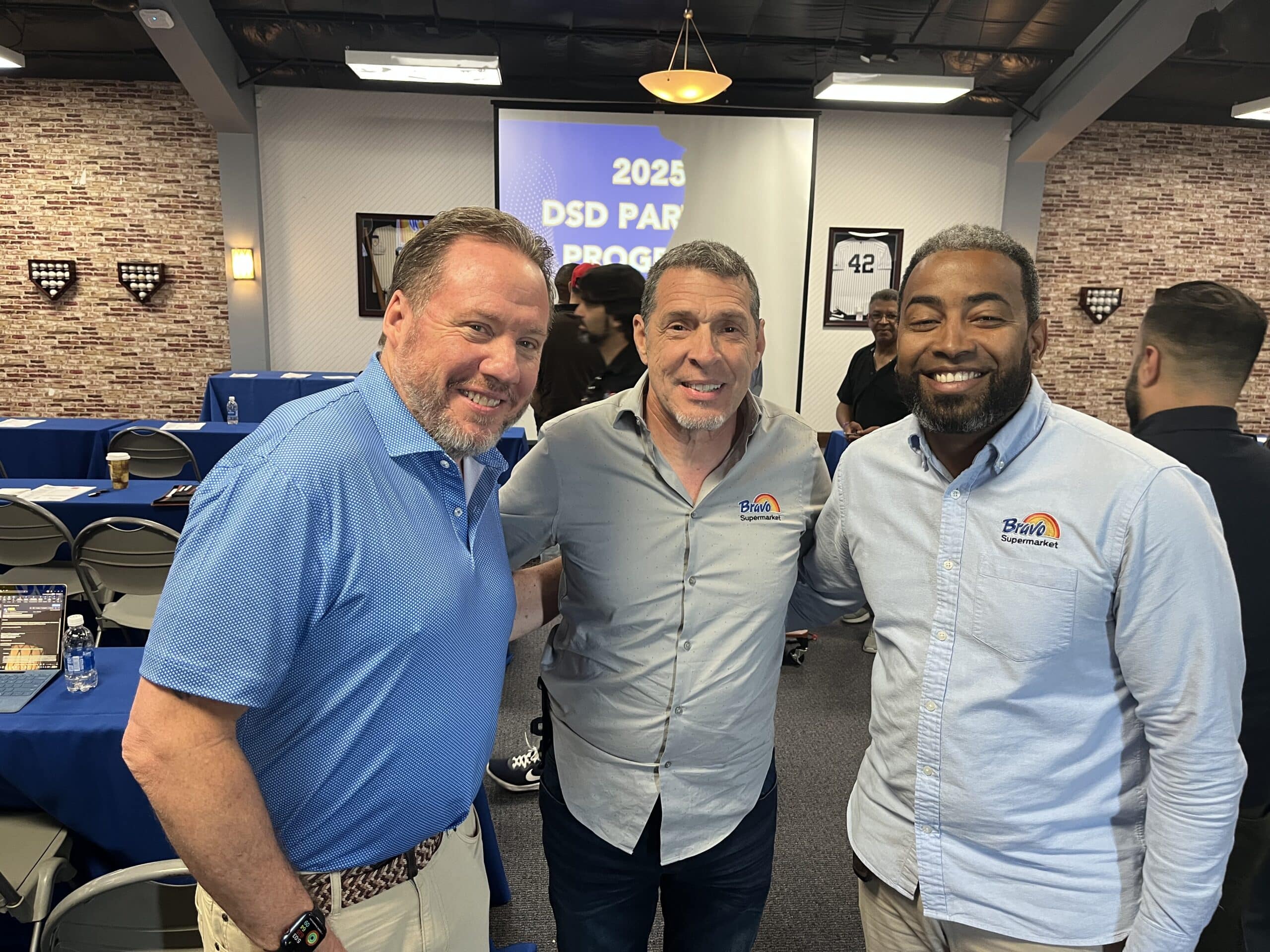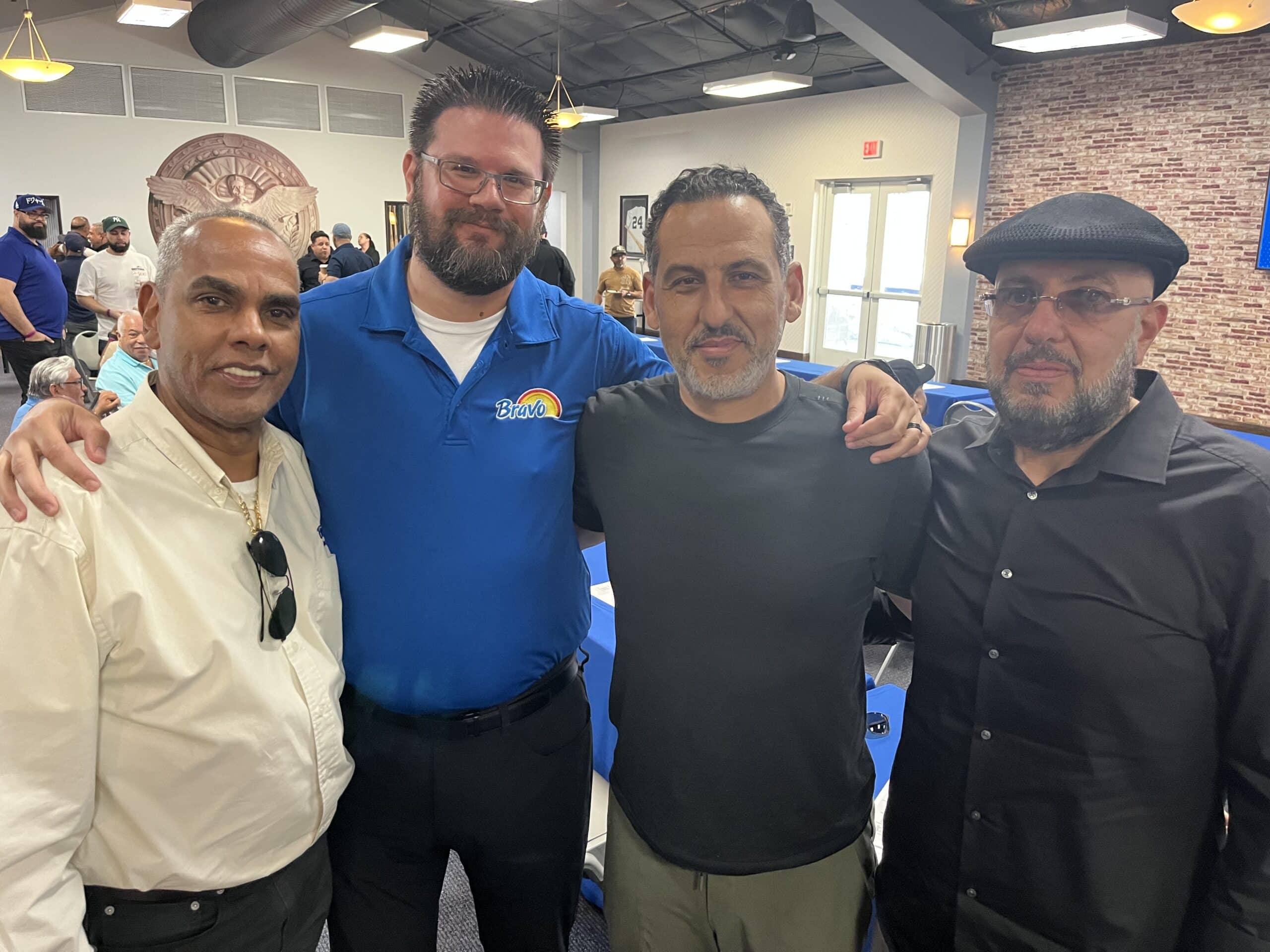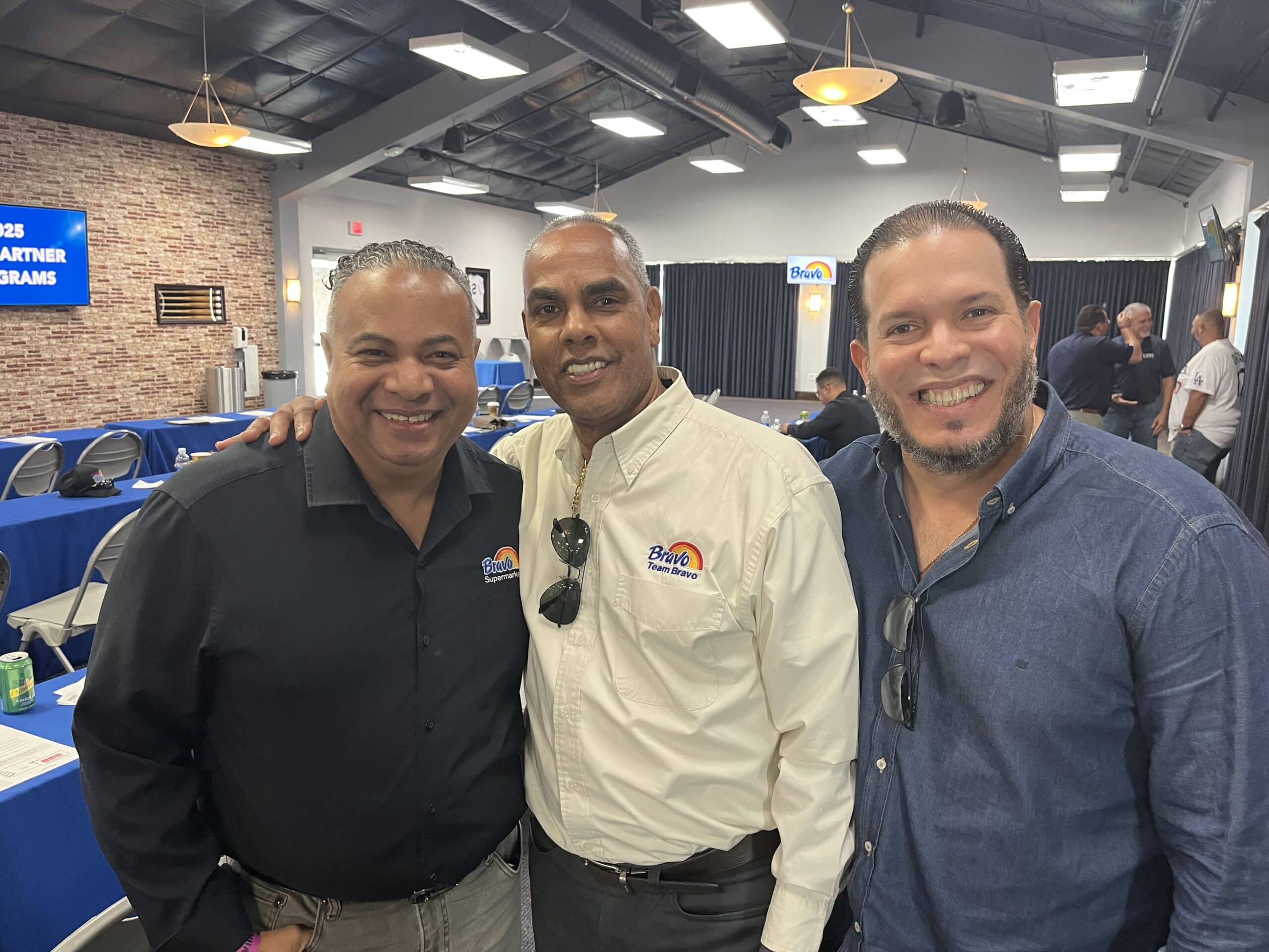 Below, Dennis Hickey of Krasdale welcomes Eddie Fernandez and Welinthon Polemeo of Bravo.